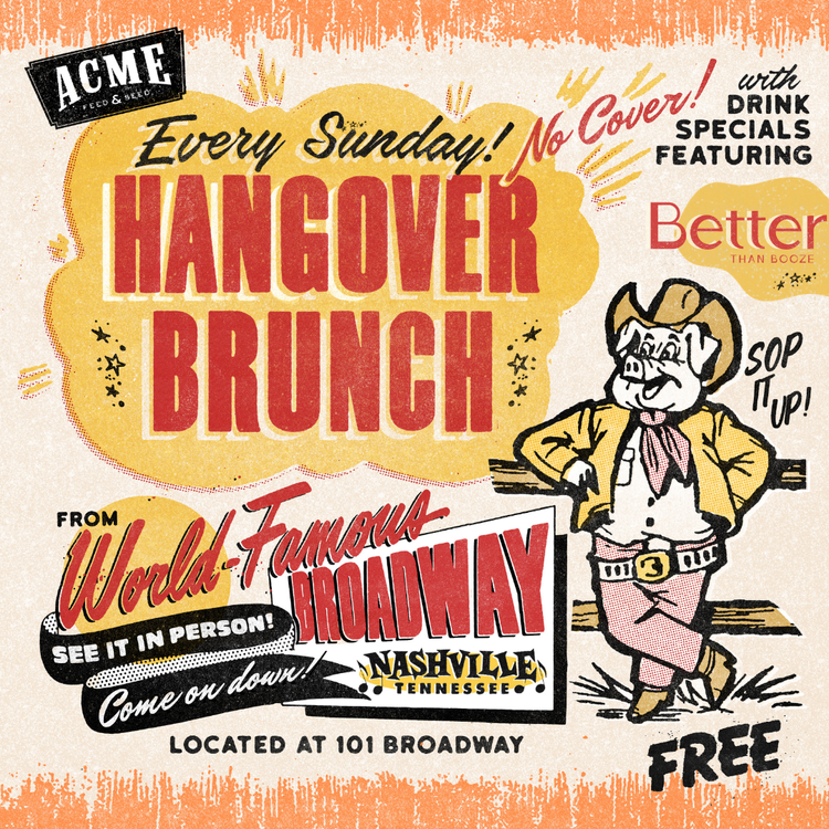 Hangover Brunch ft. Ronny Criss & The New Town Sound Sunday, February 4, 2024 11:30 AM 2:15 PM 11:30 14:15 Acme Feed and Seed 101 Broadway Nashville, TN 37201 United States (map) Google Calendar ICS